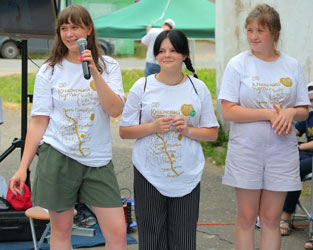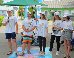 Команда Вырицкой детской библиотеки "Каждый белый человечек в кепке, футболке и с тремя значками излучает позитив, в любой ситуации он готов прийти на помощь и дать совет, поднять настроение, выслушать и понять"