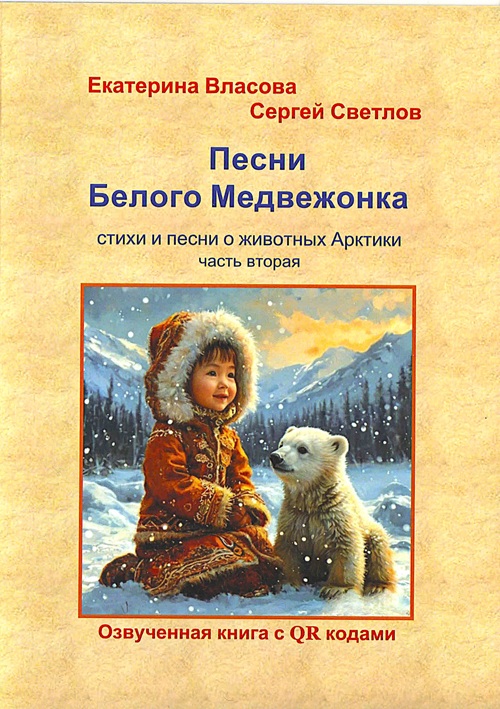 Власова Е. Песни Белого Медвежонка: стихи и песни о животных Арктики: [озвученная книга с QR кодами]: Ч.2/ Екатерина Власова, Сергей Светлов.-Москва: Перо, 2025.-44с.: ил., цв. ил., портр.