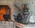 Натюрморт с русской печью,чугунком, чайником и самоваром. Масло.