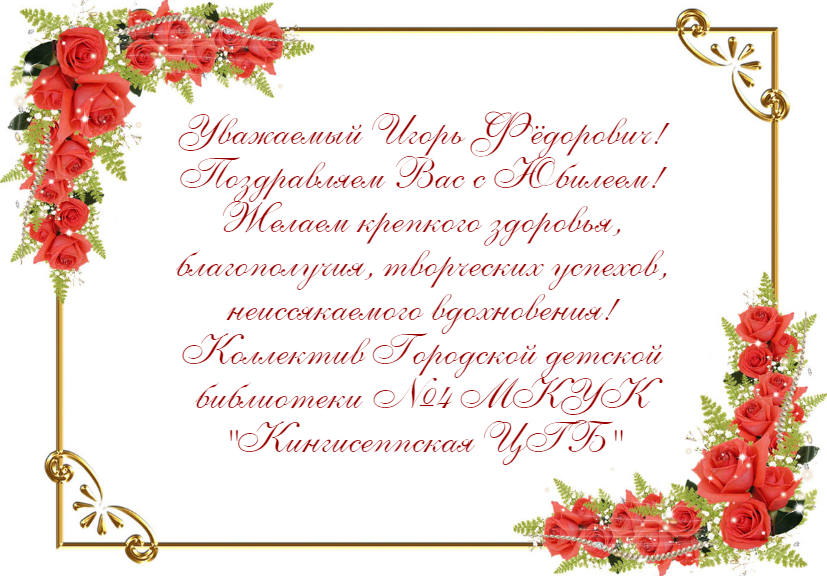 Поздравляем Вас, прекрасного писателя, автора самых разных книг, любимого многими, давнего и хорошего друга нашей библиотеки, с замечательной датой.
